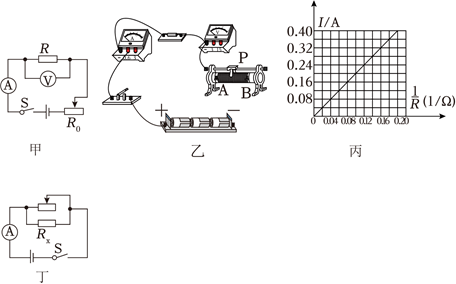 (7)小刚学习了伏安法测电阻后,用刻度尺、电流表和已知最大阻值为R1的滑动变阻器来测量未知电阻Rx的阻值。他设计了如图丁所示电路,请你帮他完成下列步骤: