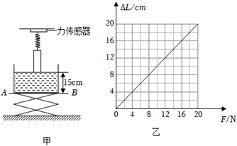 15.小刘应用图甲所示器材进行如下探究:升降台AB上放置轻质薄壁柱形容器,容器底面积为200cm2,内装15cm深的水;将弹簧上端固定在力传感器上,下端悬挂重20N、高20cm、横截面积为50cm2的长方体石块,石块下表面刚好与水面接触;已知弹簧伸长量ΔL与受到的拉力F的关系如图乙所示。将升降台AB缓慢升高(全过程水不会溢出),当传感器显示拉力为12N时(不计弹簧自重),与升降台升高前相比,容器底部受到的压强变化了 _____Pa。升降台AB升高的高度为 _____cm。(ρ水=1×103kg/m3,g=10N/kg)