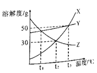 D. t1℃时,分别将X、Y、Z三种物质的饱和溶液升温至t3℃(不考虑溶剂的蒸发),所得溶液中溶质的质量分数的大小关系为:Y>Z>X