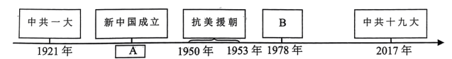 (3)请运用所学完成时间轴上史实的梳理。中共一大召开于哪座城市?(1分)这次会议的召开标志着什么?(1分)写出A处的具体时间。(1分)列举一位抗美援朝战争中的战斗英雄。(1分)B处会议开启了改革开放和社会主义现代化建设新时期,B处会议的名称是什么?(1分)在中共十九大上,被确立为中国共产党必须长期坚持的指导思想是什么?(1分)