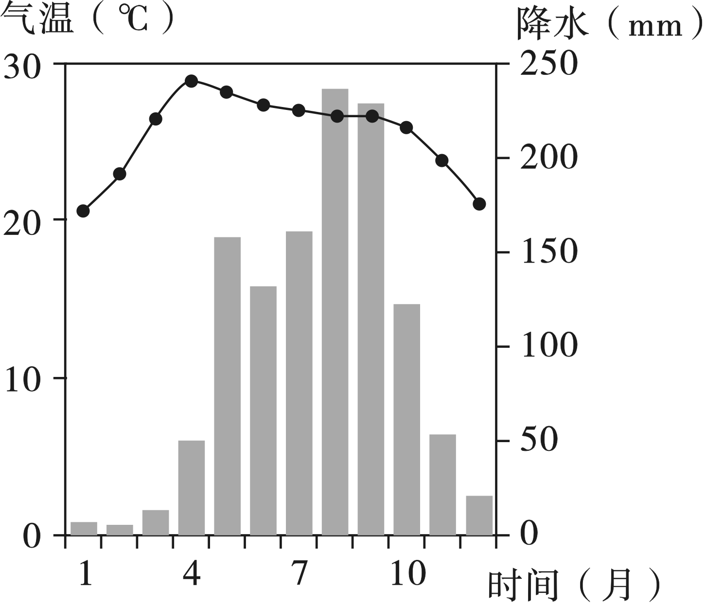 A.最大月降水量达300mm B.降水季节分配较均匀