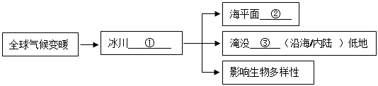 (2)在下列方框中的横线上填上恰当的词语,说明全球气候变暖对北极地区的影响。(6分)