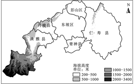 眉山市东邻内江市、自贡市、资阳市,南连乐山市,西靠雅安市,北接成都市,面积7186km2,人口295.83万(2010年),辖东坡区、彭山区、仁寿县、洪雅县、丹棱县、青神县,拥有三苏祠、瓦屋山、黑龙滩、彭祖山等旅游资源,也是国宝大熊猫的栖息地之一。读图6“眉山市地形图”,完成18~20题。