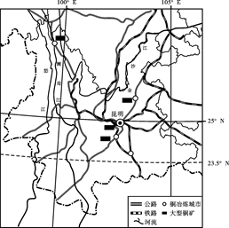 (2)从资源、交通、市场三个方面简述云南省铜矿冶炼的有利条件。(6分) 图10