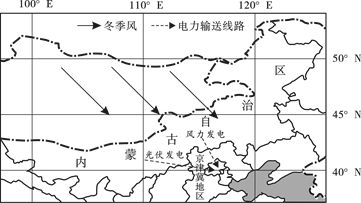 材料一:内蒙古高原辽阔坦荡,属于典型的温带大陆性气候,降水稀少,光照充足。当地为发展经济,因地制宜,草原上,一座座巨大的“风车”挥动着白色的风机叶片,将风能转变成电能;荒漠中,一块块光伏板将聚集的太阳光转化为电能。这些电能大部分输送至京津冀地区。