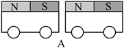 A. 如图A两个绑着磁铁的小车他们相对的两面分别是N级和S级他们相互吸引