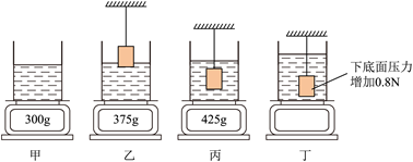 10. 如图,思考乐亮亮同学将盛水的烧杯放在电子台秤上,台秤的示数如图甲所示;将一个物块投入水中,漂浮时台秤示数为375g(如图乙),物体上表面始终保持水平,用力将物块压入全部浸没在水中,此时台秤示数为425g(如图丙);将物块继续下压,从丙到丁物块下表面受到水的压力增加了0.8N,整个过程水始终未溢出,请问说法正确的是( )