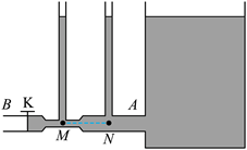 13. 如图所示的装置中,AB是一段内径粗细不同的玻璃管,它与蓄水容器相连,在玻璃管较粗和较细的部分,各接有一段竖直的细玻璃管。M、N是AB玻璃管内同一水平线上的两个点,分别位于两竖直细玻璃管下方。关闭阀门K,将水注入蓄水容器中,根据______原理,两竖直细玻璃管内水面是______的;打开阀门K,水流出过程中,M点的压强______(选填“大于”“等于”或“小于”)N点的压强。
