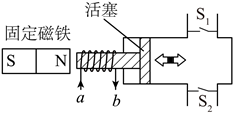 12. 现在医学上使用的心肺机的功能之一是用“电动泵”替代心脏,推动血液循环。如图所示,当线圈中的电流从a流向b时,线圈的左端为______极,此时活塞将向______运动。