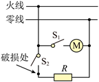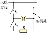 ,电动机M和电热丝R均不工作,试电笔氖管不发光。下图中,关于电路连接方式以及与铝合金吊顶接触的导线破损处的描述最合理的是( )