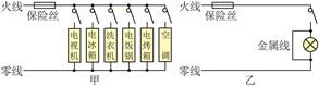 13. 如图所示的家庭电路中,开关闭合后,保险丝因电流过大而熔断。甲、乙两图产生电流过大的原因是不同的,甲图中的原因是___________;乙图中的原因是___________。