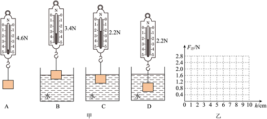 (1)表格中所缺数据为___________,请在图乙中画出浮力大小F浮与物块下表面所处深度h之间的关系图像___________;