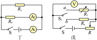 (3)小刚的设计方案如图戊所示,闭合开关S后,先将开关S1拨至触点___________,移动滑动变阻器R的滑片P至适当位置,此时电压表的示数为U;保持滑片P的位置不变,再将开关S1拨至另一触点,调节电阻箱
