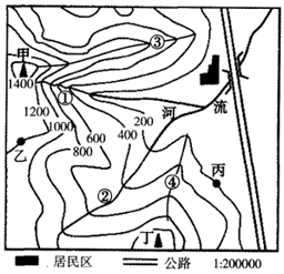 根据示意图可知等高距为200米,甲山峰在等高线1400之上,却没有到达1600米等高线,所以甲山峰海拔高度大于1400米,小于1600米。