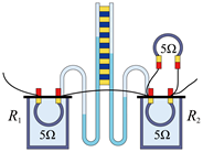 20. 图中是探究电流通过导体产生的热量与___________(选填“电流”或“电阻”)关系的装置; 装置中的 U形管___________(选填“是”或“不是”)连通器; 电流通过电阻 R2与R1产生的热量之比为___________。