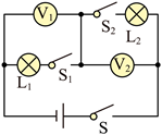 21. 如图所示,电源电压恒为9V,电压表V1、V2完全相同,连入电路的量程也相同,小灯泡L1“6V 6W”、L2“6V 3W”(灯丝电阻不变)。当开关都闭合时,电路中的电流为___________A,此时只有一个小灯泡正常发光,未正常发光的小灯泡的实际功率为___________W;断开开关S1、S2,电压表V1的示数为___________ V。