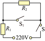 28. 某款带保温功能的电水壶,其简化电路图如图所示,S为总开关, S1为自动控制开关, R1和R2为阻值不变的发热电阻,R2=840Ω, 加热功率为 1210W,电水壶将质量1kg、初温20℃的水烧开,加热效率为84%。[c 水=4.2×103J/(kg?℃),标准大气压]求: