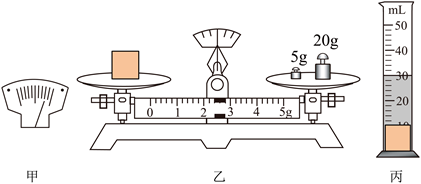 (2)测量金属块的质量,天平平衡时如图乙所示,金属块的质量为___________ g,将金属块轻轻放入盛有20mL水的量筒中,水面升高后位置如图丙所示,金属块的体积为 ___________cm3,金属块的密度为___________ g/cm3;