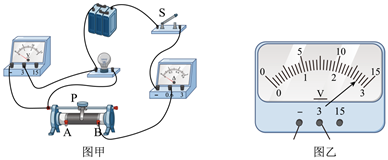 (1)闭合开关,滑动变阻器的滑片P滑到如图甲所示的位置,电压表的示数如图乙所示,电压表的示数为___________V。为使小灯泡正常发光,滑片P应向___________端移动(选填“A”或“B”)。
