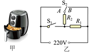 24.如图甲所示,空气炸锅利用热空气流高效快速烹制食物,以烹制食物的外酥里嫩、味美可口而广受大众的认可和欢迎。如图乙所示是某品牌空气炸锅加热部分的简化电路图,其额定电压为220V,定值电阻R1和R2为发热体,其中R2=44?。通过开关S1的通断和单刀双掷开关S2在A、B间的连接转换可实现高、中、低三个档位的调节。已知中温档的额定功率为440W。求: