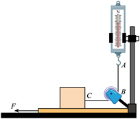 23.小勇利用如图所示的实验装置探究影响滑动摩擦力大小的因素,在水平桌面边缘固定一个定滑轮,将弹簧测力计在竖直方向调零后如图固定。在桌面放置一块长木板,将一个长方体木块平放在长木板上,通过细线绕过定滑轮与测力计相连,并保持细线的AB段竖直、BC段水平。水平向左拉动长木板,木块相对于桌面保持静止,不计细线的重力和滑轮处的摩擦力。
