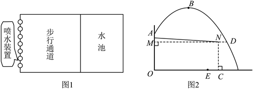 22. 城建部门计划修建一条喷泉步行通道.图1是项目俯视示意图.步行通道的一侧是一排垂直于路面的柱形喷水装置,另一侧是方形水池.图2是主视示意图.喷水装置