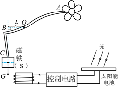 14. 图甲是一种太阳能“摆叶花”,图乙是其摆动原理图。整个摆件部分是硬质整体,由OA和OBC组成,O为摆动支点。OBC下端固定着磁铁,太阳能电池向线圈提供如图所示电流时,磁铁被推向左上方运动,使摆件顺时针小幅摆动后,立即断电,摆件会自动逆时针摆回来,如此往复。请根据图中所示情况:(1)画出磁铁所受重力的示意图及其力臂;(2)将磁铁下端的磁极名称填入括号中。