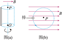 4. 如图,空间中存在水平向右的匀强磁场,一导体棒绕固定的竖直轴OP在磁场中匀速转动,且始终平行于OP。导体棒两端的电势差u随时间t变化的图像可能正确的是( )