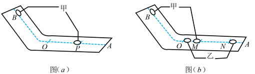 )。将硬币甲放置在斜面一某一位置,标记此位置为B。由静止释放甲,当甲停在水平面上某处时,测量甲从O点到停止处的滑行距离OP。将硬币乙放置在O处,左侧与O点重合,将甲放置于B点由静止释放。当两枚硬币发生碰撞后,分别测量甲乙从O点到停止处的滑行距离OM和ON。保持释放位置不变,重复实验若干次,得到OP、OM、ON的平均值分别为