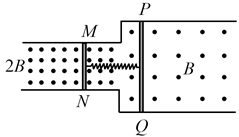 10. 如图,两根光滑平行金属导轨固定在绝缘水平面上,左、右两侧导轨间距分别为d和2d,处于竖直向上的磁场中,磁感应强度大小分别为2B和B。已知导体棒MN的电阻为R、长度为d,导体棒PQ的电阻为2R、长度为2d,PQ的质量是MN的2倍。初始时刻两棒静止,两棒中点之间连接一压缩量为L的轻质绝缘弹簧。释放弹簧,两棒在各自磁场中运动直至停止,弹簧始终在弹性限度内。整个过程中两棒保持与导轨垂直并接触良好,导轨足够长且电阻不计。下列说法正确的足( )