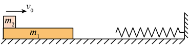 15. 如图,质量m1= 1kg的木板静止在光滑水平地面上,右侧的竖直墙面固定一劲度系数k = 20N/m的轻弹簧,弹簧处于自然状态。质量m2= 4kg的小物块以水平向右的速度