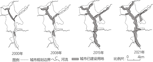 城镇空间形态演变具有明显的动态特征。下图为我国某县级市不同时期城镇空间形态演变示意图。完成下面小题。