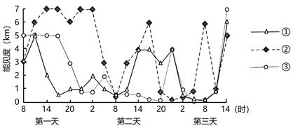 贵州中西部地区冬季多出现水平能见度小于1千米的锋面雨雾,雾区位于锋线附近。下图为贵州某次锋面雨雾发生过程中,大致呈纬向分布的三个测站测得的能见度变化图。这次雨雾形成的气象条件是西南气流沿锋后弱冷平流爬升,形成弱降水。雨雾随锋面缓慢东移消亡。完成下面小题。