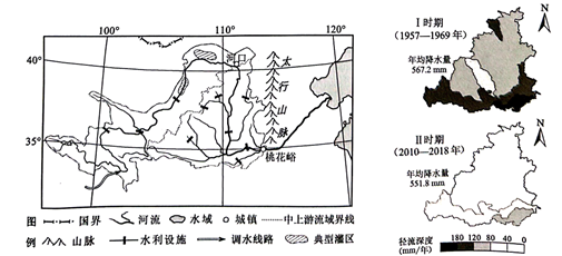 材料二图1为黄河中上游流域略图。图2为黄河中游两个时期径流深度空间分布示意图。