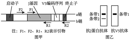 (3)重组质粒在受体细胞内正确表达后,用抗J蛋白抗体和抗V5抗体分别检测相应蛋白是否表达以及表达水平,结果如图乙所示。其中,出现条带1证明细胞内表达了__________,条带2所检出的蛋白______________(填“是”或“不是”)由重组质粒上的J基因表达的。