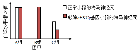 实验I:探究高糖环境和蛋白激酶cPKCγ对离体小鼠海马神经元自噬的影响。配制含有5mmol/L葡萄糖的培养液模拟正常小鼠的体液环境。将各组细胞分别置于等量培养液中,A组培养液不处理,B组培养液中加入75mmol/L的X试剂1mL,C组培养液中加入75mmolL葡萄糖溶液1mL。实验结果见图甲。