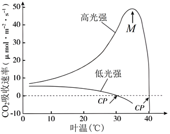 A. 在低光强下,CO2吸收速率随叶温升高而下降的原因是呼吸速率上升