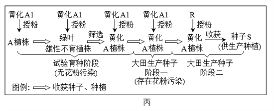 (3)油菜雄性不育品系A作为母本与可育品系R杂交,获得杂交油菜种子S(杂合子),使杂交油菜的大规模种植成为可能。品系A1育性正常,其他性状与A相同,A与A1杂交,子一代仍为品系A,由此可大量繁殖A。在大量繁殖A的过程中,会因其他品系花粉的污染而导致A不纯,进而影响种子S的纯度,导致油菜籽减产。油菜新生叶黄化表型易辨识,且对产量没有显著影响。科学家设想利用新生叶黄化性状来提高种子S的纯度。育种过程中首先通过一系列操作,获得了新生叶黄化的A1,利用黄化A1生产种子S的育种流程见图丙。