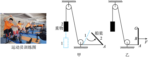 29. 赛龙舟自古以来在我国广为流传,现已成为亚运会比赛项目。如图是运动员在室内进行划桨训练的两个场景,图甲是训练装置的结构示意图,绳子系在“船桨”的A端,运动员坐在位置上用力将“船桨”从位置“1”划到位置“2”,重物的位置也发生了相应的变化。若重物的质量为20千克,“划桨”一次拉过绳子的距离为60厘米。(船桨重、绳重与摩擦均不计)