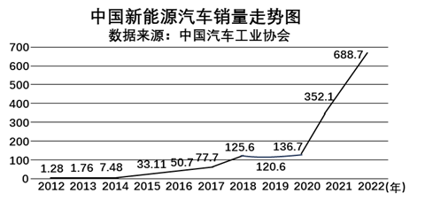 ①2012年至2022年中国新能源汽车销量一直呈上升趋势