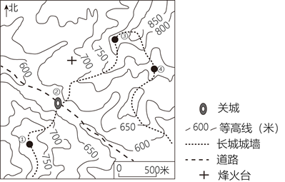 明明同学打算暑假去攀登长城,攀登前对某地长城等高线地形图进行了研究。据此完成下面小题。
