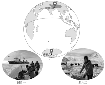 【答案】(1)照片一为南极点的科学考查场景,南极地区纬度高,气候寒冷,海面结冰,多冰川,需要破冰船辅助前行。照片二为珠穆朗玛峰的科学考查场景,图片中显示有被称为“高原之舟”的牦牛,牦牛是青藏地区的代表性动物。