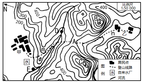 (1)同学们分别从图中甲、乙两村出发,经m、n两条路线在A处集合。两条路线中相对平缓的是_________,集合处的山体部位名称是_________。