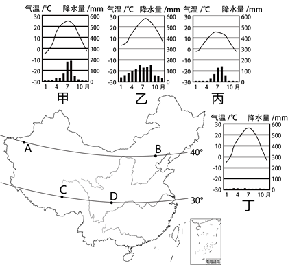 (1)请将甲、乙、丙、丁四种气候类型与A、B、C、D四地进行正确组合。