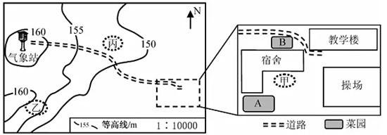 (3) ①. 甲 ②. 乙地块等高线最密集,坡度最陡,建水土保持园有利于保持水土 ③. 丙 ④. 丙地块离宿舍楼更远,更卫生