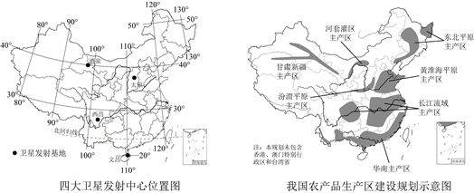 44. 科技发展助力我国国家实力的不断提升,近年来我国在航天、粮食安全等方面成绩卓著。目前,我国已经拥有了西昌、太原、酒泉和文昌四大卫星发射中心。粮食安全是现阶段国际社会普遍关注的问题,加强粮食安全也是我国目前的重要任务。结合图文资料,完成下列问题。