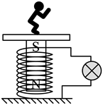 16. 某幼儿园游乐室里有一块能发电的地板,当小朋友们在上面跳跃时,小灯泡便会一闪一闪,地板下方铺设的结构如图所示,当踩踏地板时,固定在地板下方的磁铁往复运动、使固定在地面上的弹簧线圈做______。磁感线运动,闭合电路中产生______,小灯泡发光。