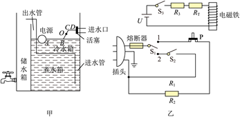 32. 图甲是某型号电开水器结构简图,图乙是它的电路原理图。控制进水口的浮球阀由不锈钢浮球、绕O点转动的金属杆