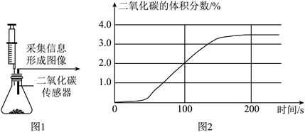 【实验2】按图1所示,将白色浑浊物装入锥形瓶中,用注射器注入适量稀盐酸,并利用二氧化碳传感器测得锥形瓶中二氧化碳的体积分数随时间的变化如图2所示。