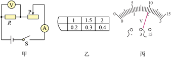 (4)用“2.5V,0.3A”的小灯泡替换R来完成研究小灯泡电阻的实验。闭合开关移动滑片,电压表示数如图丙,此时电压为___________V,电流表示数可能是下列数据中的___________(选填序号)。